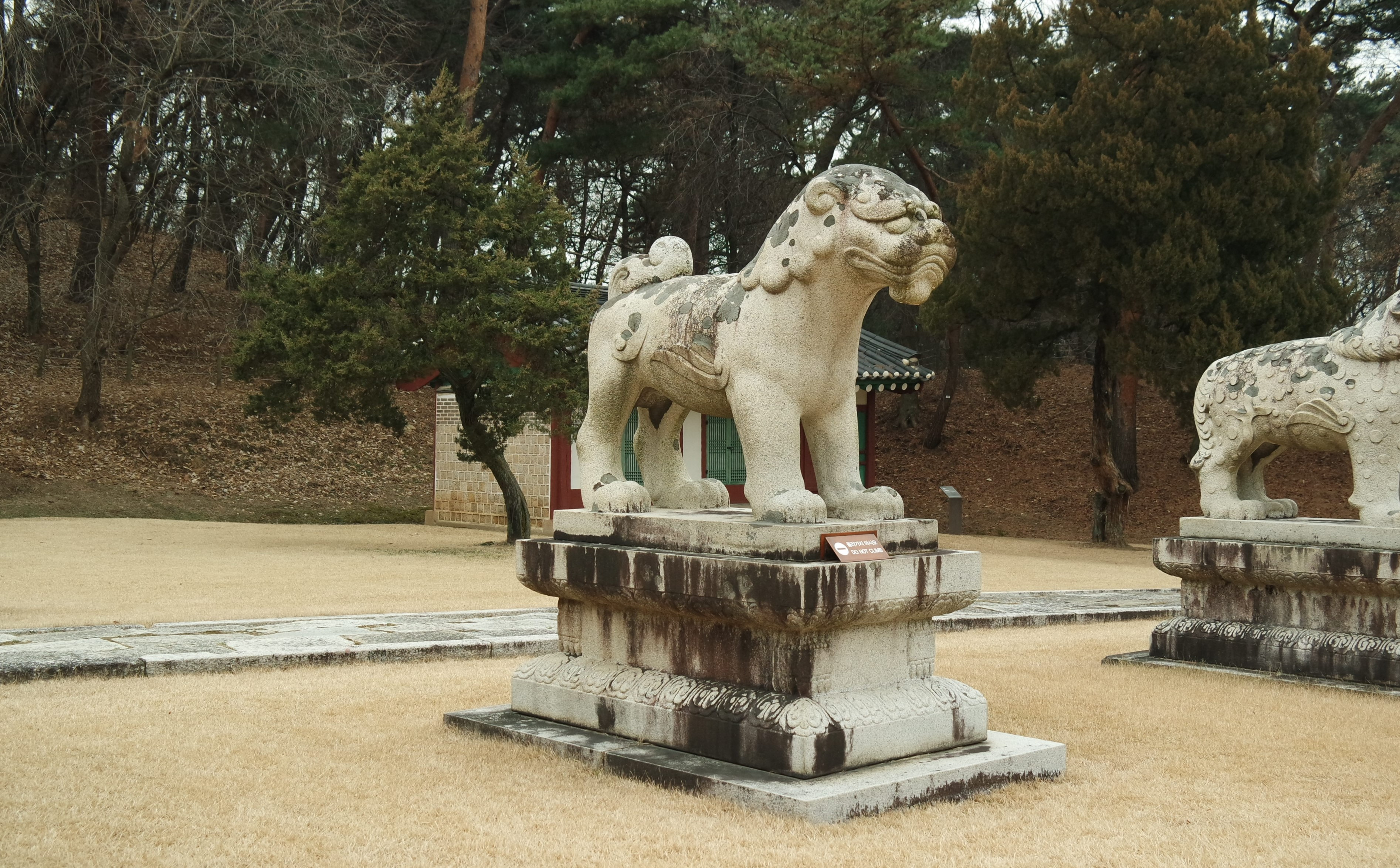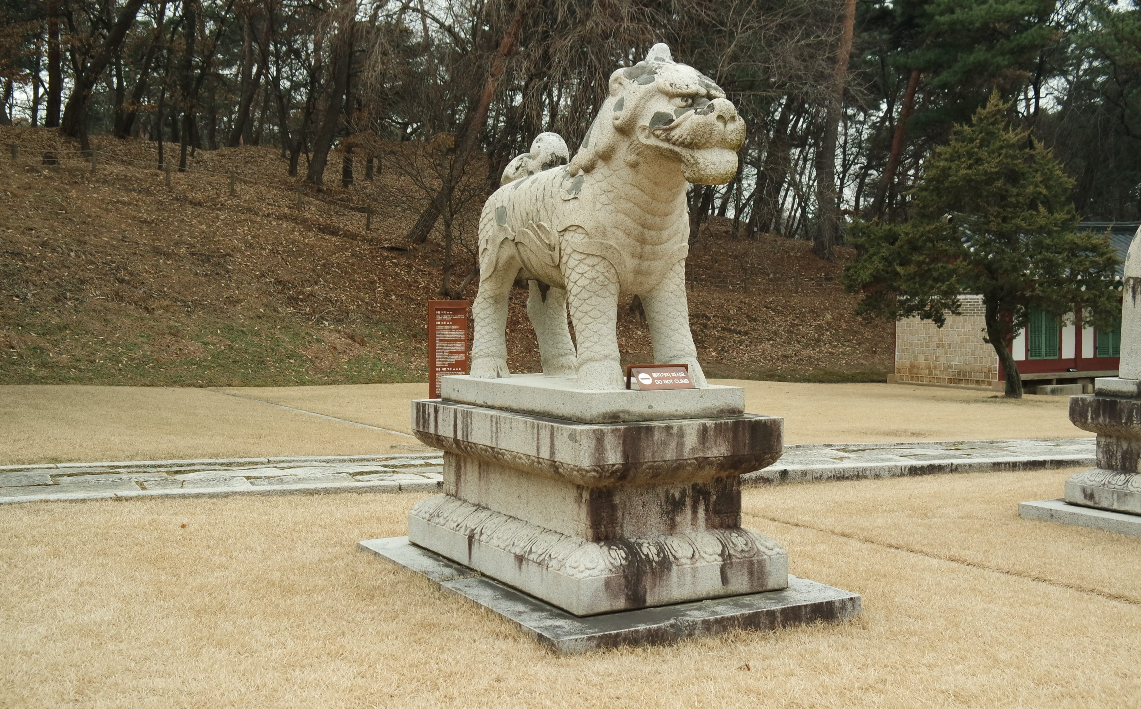사자상은 기린상과 공통된 요소들이 눈에 띤다. 전체 길이는 217cm 정도이다. 기린상과 비교해 보면 네 다리로 서 있는 자세, 귀 양 옆으로 목덜미까지 넓게 덮혀 있는 끝이 동글동글하게 말려 있는 갈기 표현, 양 옆구리의 날개 표현 등에서 동일하다. 과장되게 돌출되어 표현된 눈과 코, 입의 표현에서도 공통점을 볼 수 있다.