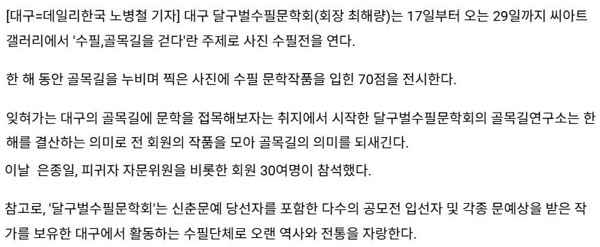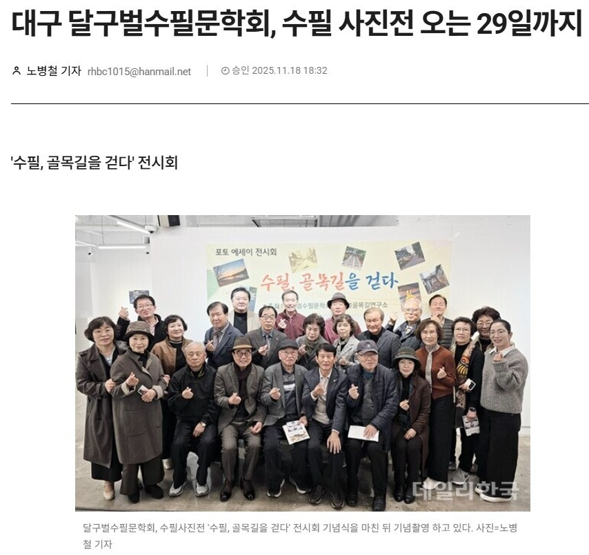 달구벌수필문학회 - 수필사진전 오는 29일까지 작성자김규인|작성시간25.11.18|조회수35 목록 댓글 0 글자크기 작게가 글자크기 크게가 다음검색 현재 게시글 추가 기능 열기 북마크 공유하기 신고 센터로 신고 댓글 댓글 0 댓글쓰기 답글쓰기 댓글 리스트