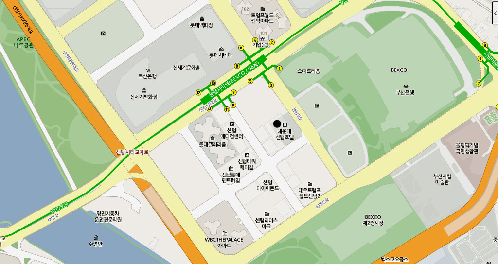 1. 승용차 : 수영교를 지나 센텀시티로 들어선 뒤 신세계백화점 맞은편 롯데 갤러리움을 지나면 오른편에 센텀호텔이 보임.