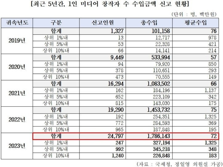 ◇작년, 유튜버·BJ 등 1인 미디어 2만4797명 수입 신고…5년 새 19배 증가