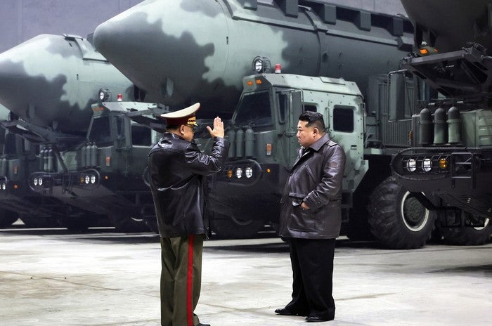 김정은 북한 국무위원장이 전략미사일 기지를 방문해 고체연료 대륙간탄도미사일(ICBM) ‘화성-18형’이 실린 것으로 추정되는 이동식 발사차량 앞에서 ‘미사일 개발 총책’인 김정식 노동당 제1부부장에게 경례를 받고 있다.