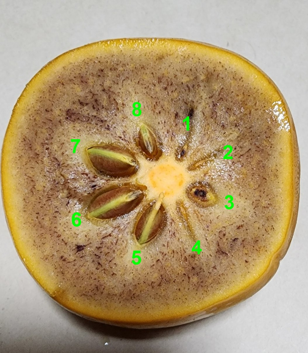 ① 감(먹감) 씨앗 사진 : 곶감도 동일함( 2.4번 씨방은 씨가 자라지 못하고 6개 씨앗이 있음 )