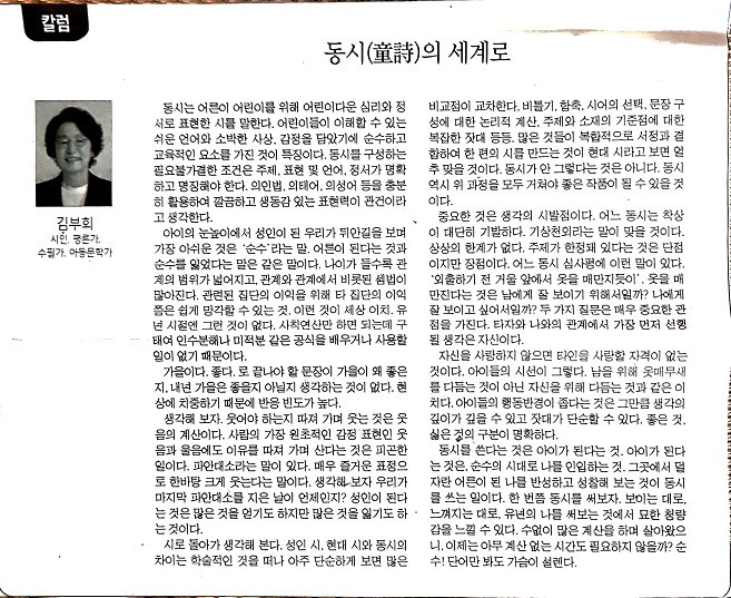 동시는 어른이 어린이를 위하여 어린이다운 심리와 정서로 표현한 시를 말한다. 어린이들이 이해할 수 있는 쉬운 언어와 소박한 사상, 감정을 담았기에 순수하고 교육적인 요소를 가진 것이 특징이다. 동시를 구성하는 필요불가결한 조건은 주제, 표현 및 언어, 정서가 명확하고 명징해야 한다. 의인법, 의태어, 의성어 등을 충분히 활용하여 깔끔하고 생동감 있는 표현력이 관건이라고 생각한다. 아이의 눈높이에서 성인이 된 우리가 뒤안길을 보며 가장 아쉬운 것은 (순수)라는 말. 어른이 된다는 것과 순수를 잃었다는 말은 같은 말이다. 나이가 들수록 관계의 범위가 넓어지고, 관계와 관계에서 비롯된 셈법이 많아진다. 관련된 집단의 이익을 위해 타 집단의 이익쯤은 쉽게 망각할 수 있는 것. 이런 것이 세상 이치. 유년 시절엔 그런 것이 없다. 사칙연산만 하면 되는데 구태여 인수분해나 미적분 같은 공식을 배우거나 사용할 일이 없기 때문이다. 가을이다. 좋다.로 끝나야 할 문장이 가을이 왜 좋은지, 내년 가을은 좋을지 아닐지 생각하는 것이 없다. 현상에 치중하기 때문에 반응 빈도가 높다. 웃어야 하는지 따져 가며 웃는 것은 웃음의 계산이다. 사람의 가장 원초적인 감정 표현인 웃음과 울음에도 이유를 따져 가며 산다는 것은 피곤한 일이다. 파안대소라는 말이 있다. 매우 즐거운 표정으로 한바탕 크게 웃는다는 말이다. 생각해 보자 우리가 마지막 파안대소를 지은 날이 언제인지? 성인이 된다는 것은 많은 것을 얻기도 하지만 많은 것을 잃기도 하는 것이다.