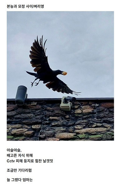 먹이를 물고 가는 어미새의 움직임을 생생하게 포착했다. 더불어 cctv위를 날아가는 모습까지 풍경에 담았다. 단순하게 먹이를 물고 날아가는 것이 아니라, 배고픈 자식위해 cctv를 피해 가며 둥지로 귀환하는 새의 움직임으로 사진과 풍경에 생명을 불어넣었다. 먹이라는 본능과 둥지의 새끼들에게 전달하려는 모정을 시적 질감으로 잘 표현한 작품이다. 좀 더 확장하여 /늘 그랬다/ 엄마는/이라는 성찰이 담긴 문장으로 결구를 완성한 것이 이 작품의 매력이다. 사진과 시제와 본문이 황금비율로 잘 어울리는 좋은 디카시의 효시라고 볼 수 있을 것이다.