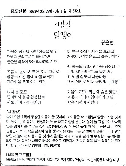 봄이 오면 초록이 무성한 여름이 올 것이며, 그 여름을 타고 담쟁이덩굴이 자랄 것이다. 땅이든, 벽 틈이든 담쟁이는 담을 타고 계절을 넘는다. 삶이 늘 그렇듯이 하나의 담을 넘어 나를 키우는 것이 담쟁이덩굴. 좀 더 높은 곳에 더 많은 곳을 보는 것이 본능인가 보다. 작은 담조차 넘을 생각도 못 하는 나는 담 앞에서 멈춘다. 이내 말라버린다. 봄이다. 여름이 올 것이다. 올해는 저기 저 담을 넘어 볕 무성한 다른 세계를 봐야 한다. 폭우가 내려도, 태풍이 불어도 의연하게 견디고 담을 넘는 담쟁이가 되어야 할 것이다. (글/ 김부회 시인, 평론가)
