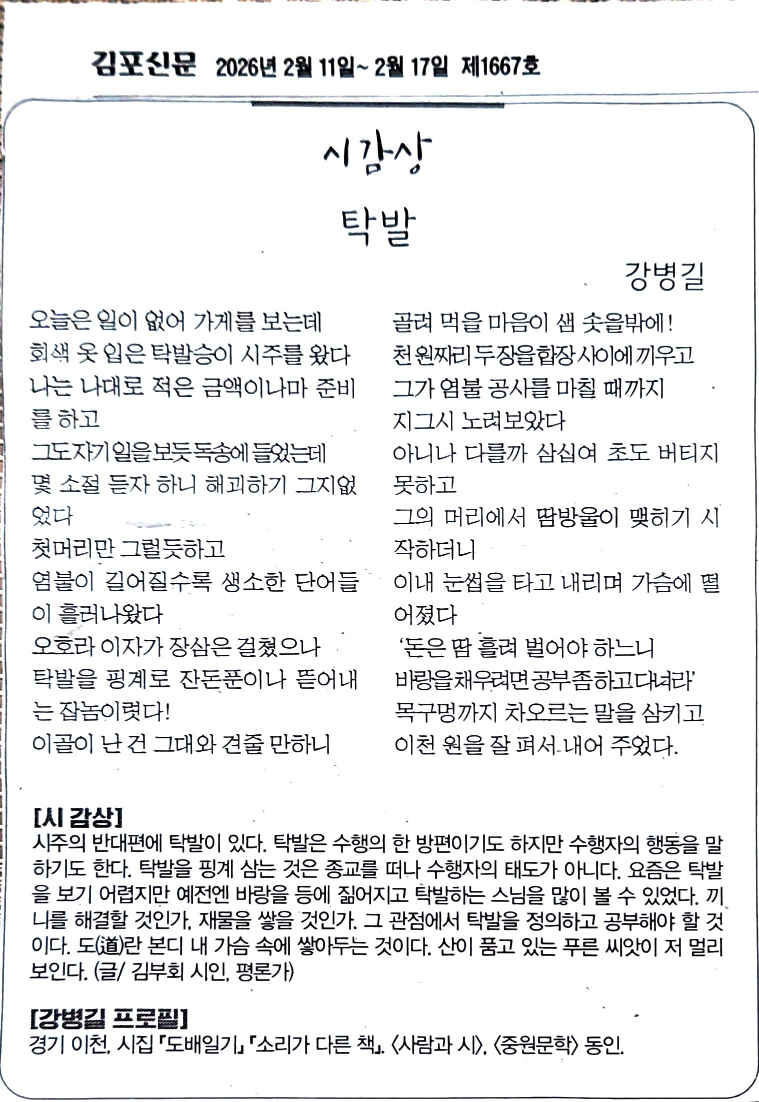 시주의 반대편에 탁발이 있다. 탁발은 수행의 한 방편이기도 하지만 수행자의 행동을 말하기도 한다. 탁발을 핑계 삼는 것은 종교를 떠나 수행자의 태도가 아니다. 요즘은 탁발을 보기 어렵지만, 예전엔 바랑을 등에 짊어지고 탁발하는 스님을 많이 볼 수 있었다. 끼니를 해결할 것인가, 재물을 쌓을 것인가. 그 관점에서 탁발을 정의하고 공부해야 할 것이다. 도 道란 본디 내 가슴 속에 쌓아두는 것이다. 산이 품고 있는 푸른 씨앗이 저 멀리 보인다. (글/ 김부회 시인, 평론가)