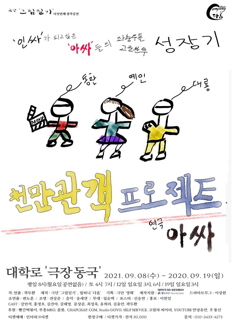 "아싸" (부제:천만관객 프로젝트 작,연출:곽두환 조명:전상준 음악:송세연 무대:임순택 출연:최성욱, 김태영, 유희리 제작:극단 그림일기 극장:극장 동국 별점:★★★☆☆) 전작 "창수" 를 봤었던 극단 그림일기 공연이다. 천만관객의 영화를 만들고 싶어하는 아싸 엔터테인먼트 대표와 학교폭력의 트라우마를 벗어나고 싶어하는 아웃사이더, 대한민국 최고의 여배우를 꿈꾸는 배우 지망생의 얘기이다. 단순한 스토리 이지만 배우들의 열정적인 연기가 좋았다. 그 중에서 전작 "환향" 에서 봤었던 유희리 배우님이 예쁜 모습으로 연기를 잘 해 주었다.