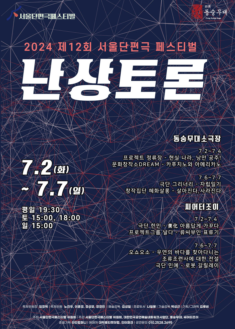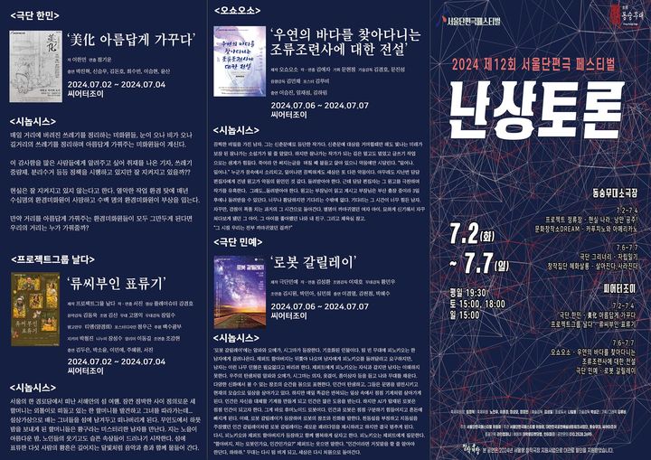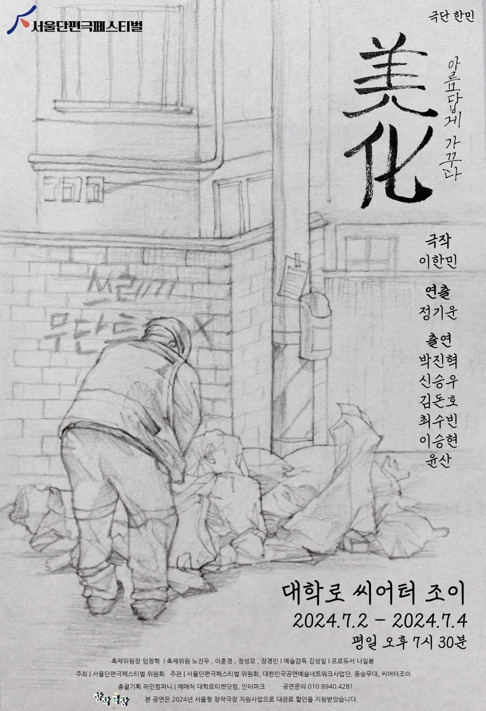 "美化 아름답게 가꾸다, 류씨부인 표류기" ("美化 아름답게 가꾸다"-작:이한민 연출:정기운 출연:박진혁, 신승우, 김돈호, 최수빈, 이승현, 윤산 제작:극단 한민 극장:씨어터조이 별점:★★★☆☆ "류씨부인 표류기"-작,연출:서진 영상:플레이슈터 강경호 음악감독:김동욱 조명:김산 무대:고영익 탱고안무:티엠(양경희) 포스터디자인:정우근 출연:김두은, 박소윤, 이민애, 주혜원, 서진 제작:프로젝트그룹 날다 극장:씨어터조이 별점:★★★★☆) 2024 제12회 서울단편극 페스티벌 첫 번째 작품이다. "美化 아름답게 가꾸다"-환경미화원의 얘기이다. 이 극장의 빔프로젝트는 정말 좋은듯... 영상이 좋아서 별점 1개 추가... "류씨부인 표류기"-작년에 "아브라소" 를 봤었던 프로젝트그룹 날다 두번째 작품이다. 할머니들 너무 귀엽고 연기를 잘한다. 언제나 신뢰하는 서진 배우님과 '프로젝트그룹 날다' 를 응원합니다. 공연은 목요일 까지 하니 많이 보러 가세요...