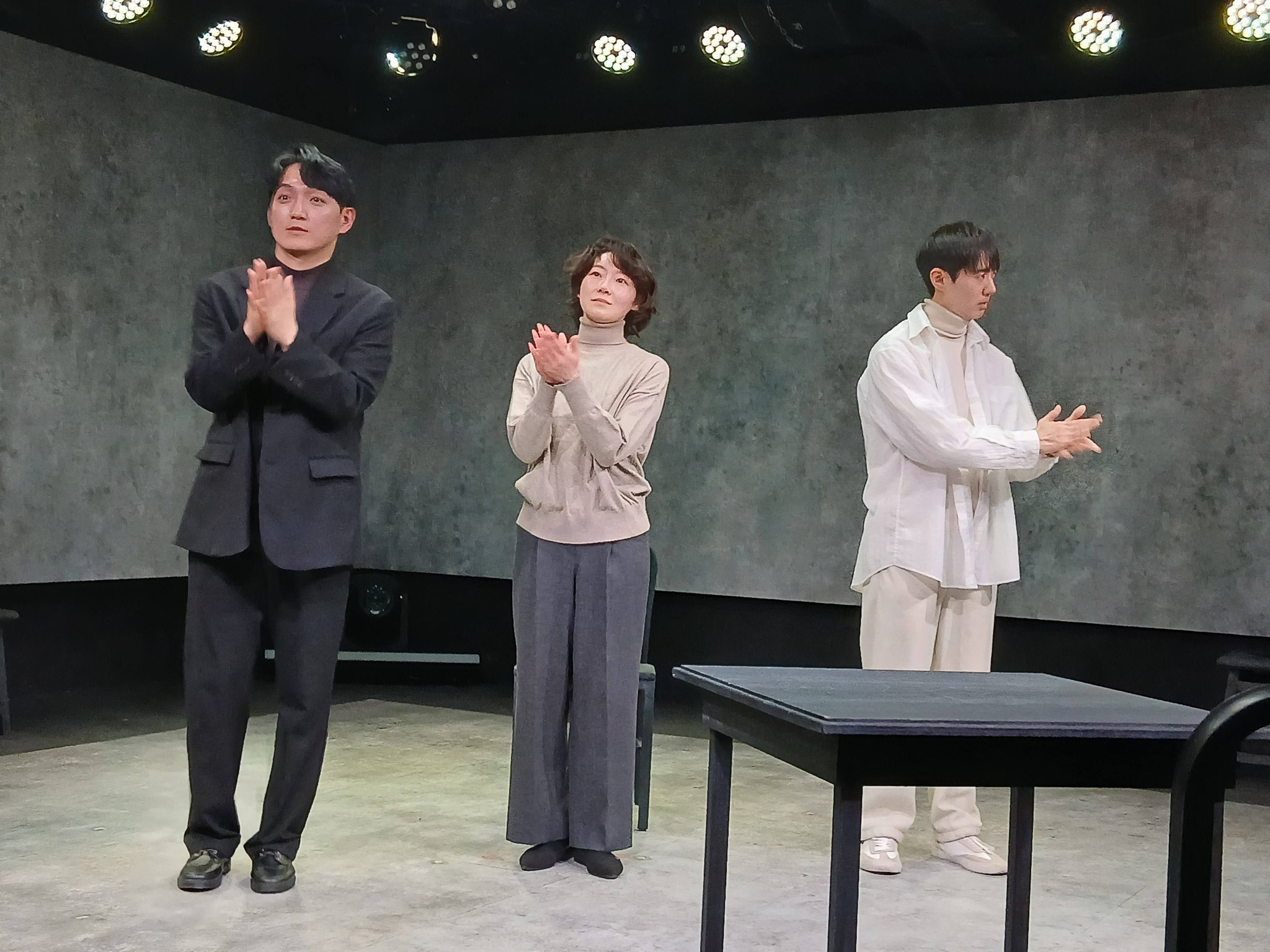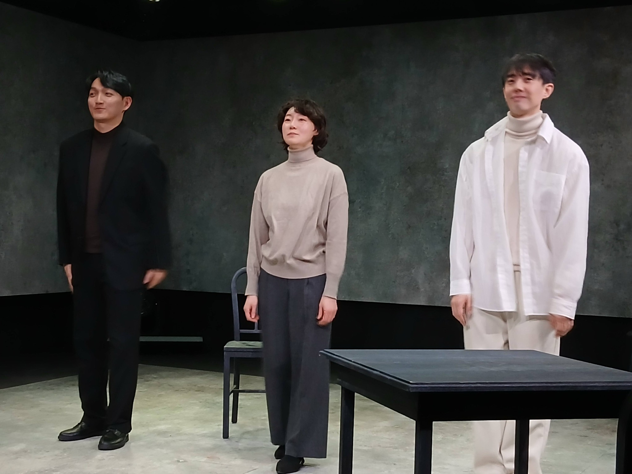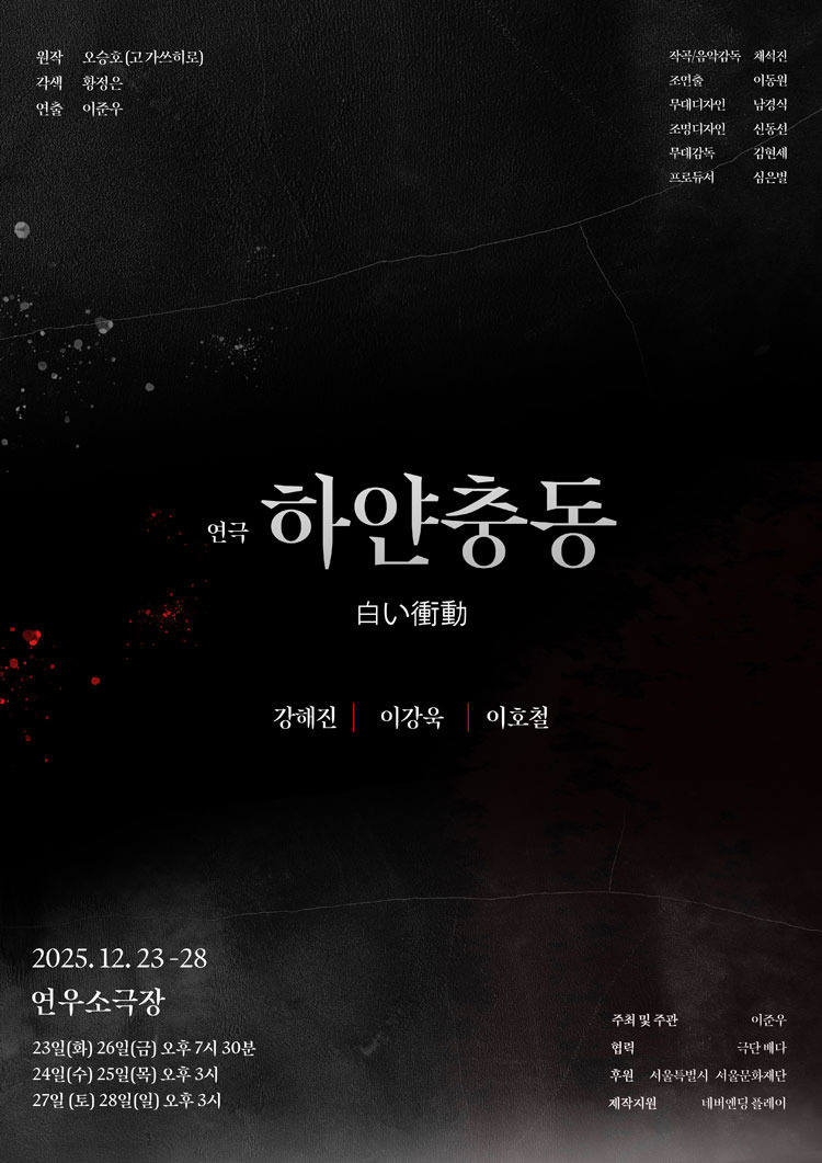 "하얀충동" (원작:오승호(고 가쓰히로) "하얀충동"(출판,고단샤) 각색:황정은 연출:이준우 작곡,음악감독:채석진 무대디자인:남경식 조명디자인:신동선 출연:강해진, 이강욱, 이호철 주최:이준우 협력:극단 배다 제작지원:네버엔딩플레이 극장:연우소극장 별점:★★★☆☆) 덴조 학교에서 스쿨 카운슬러로 일하는 지하야에게 고등학교 1학년생 아키나리가 찾아온다. 마침 이들이 사는 지역에 15년 전 잔혹한 범행을 저지른 이리이치가 복역을 마치고 돌아왔다. 지역 주민들은 절대로 그를 받아들일 수 없다며 농성을 벌이고, 평소 '포용과 공생' 의 중요성을 주장하던 지하야는 고민에 빠진다. 살인과 범죄의 충동을 갖고 있는 자들과 우리는 과연 공생할 수 있는가, 우린 그들을 어디까지 포용할 수 있는가.