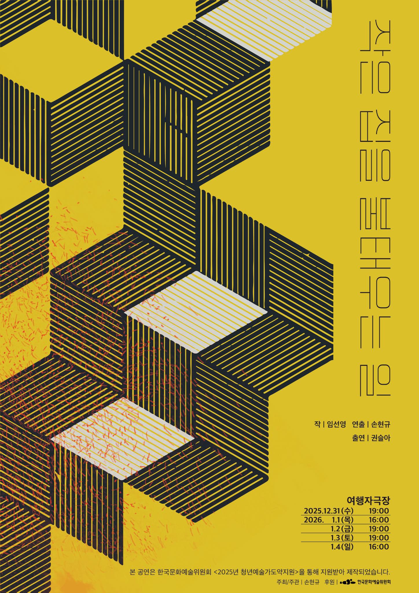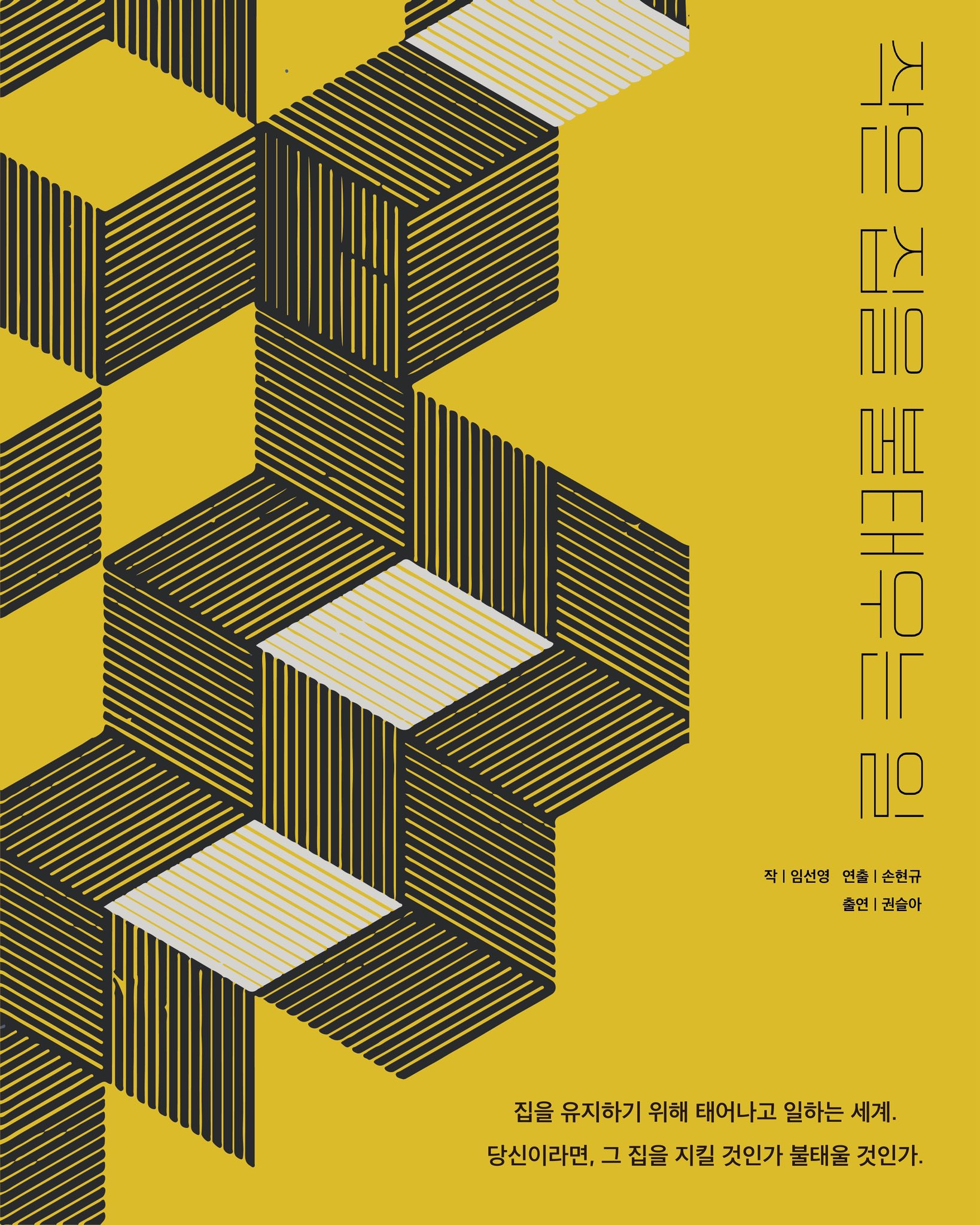 "작은 집을 불태우는 일" (작:임선영 연출:손현규 시노그라피:이승희 조명:손민영 음악:정준규 분장:남혜연 출연:권슬아 주최:손현규 극장:여행자극장 별점:★★★☆☆) 가을, 일벌 90은 집의 규칙에 의문을 품기 시작한다. 집은 점점 비대해지지만 내부는 서서히 무너져간다. 그리고 겨울, 누군가 이 집의 문을 두드린다. 과연 90은 집을 유지하기 위해 더 많은 죽음을 반복할 것인가, 아니면 모든 규칙의 근원인 집을 불태울 것인가.