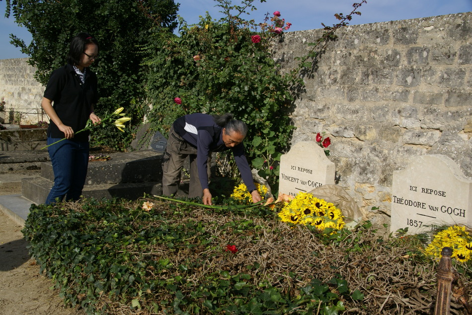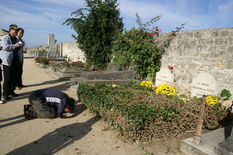 고흐 형제 무덤 앞에 한국적으로 인사를 하는 시원 박태후 화백.