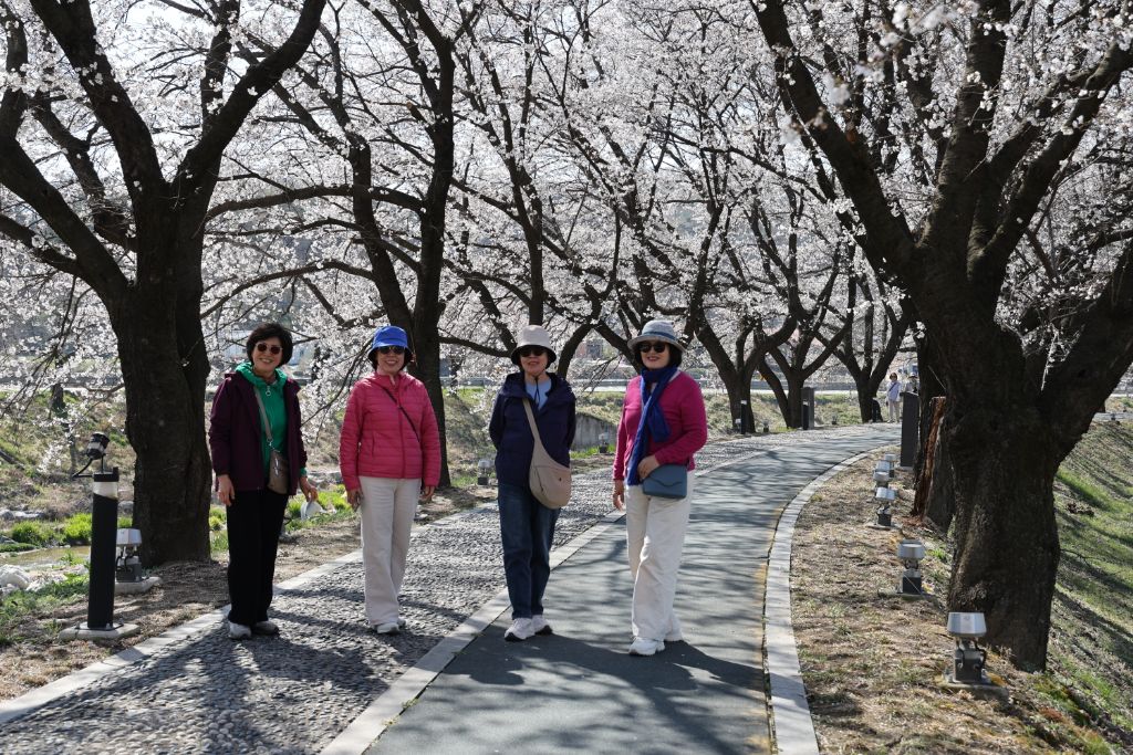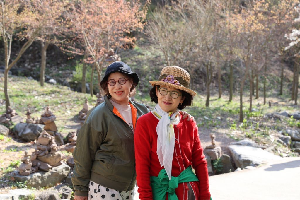 우정은 화려한 벚꽃 아래서 더 빛났습니다.