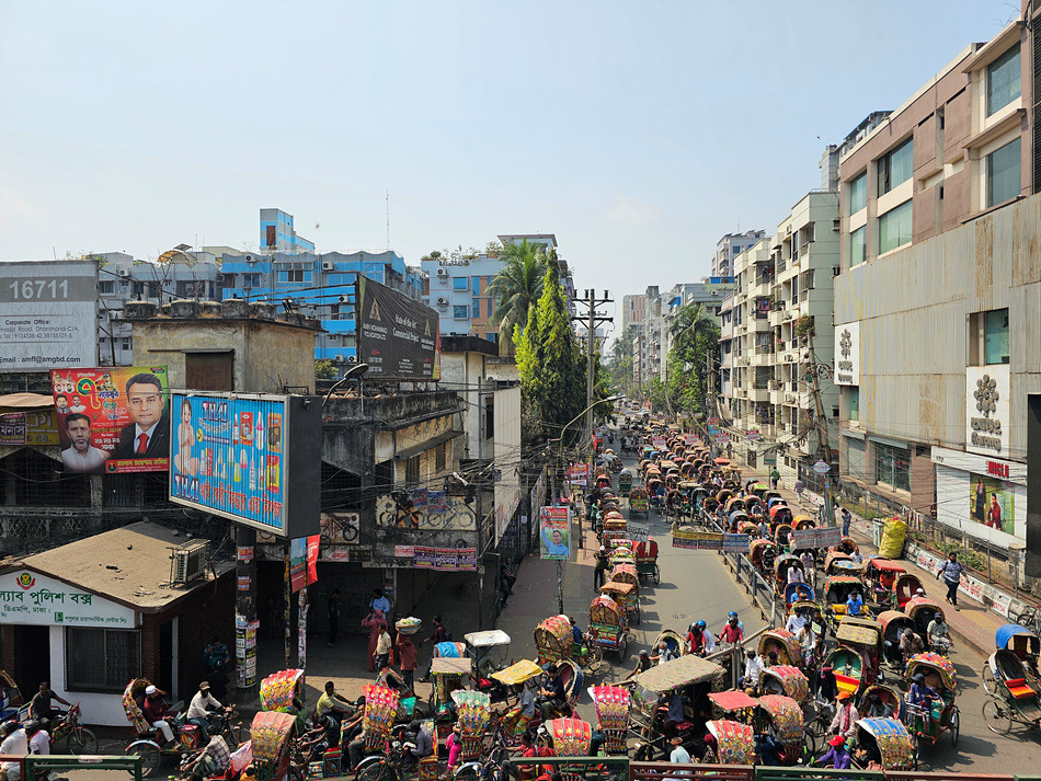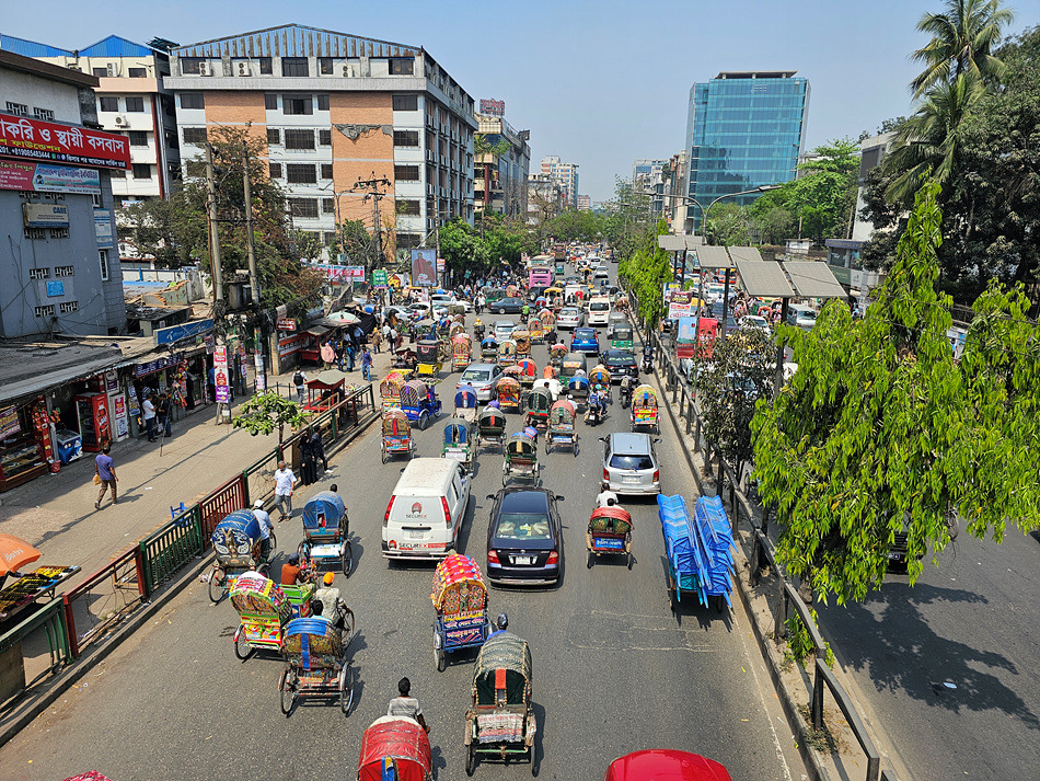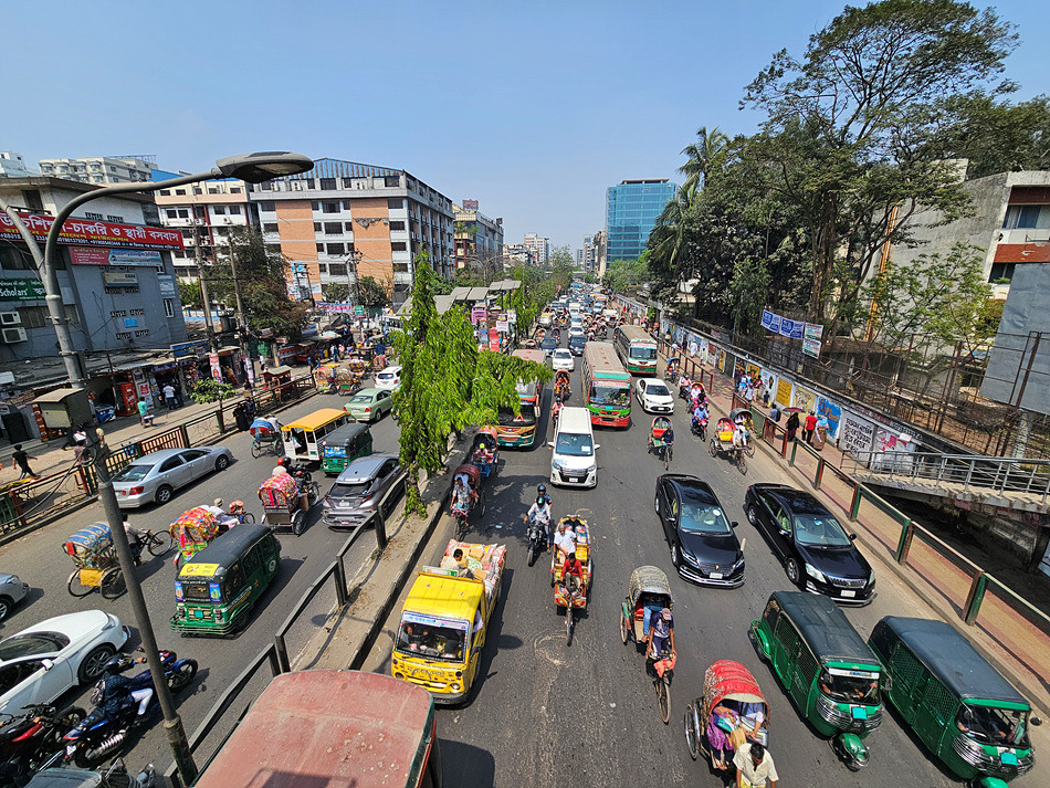 다카의 시내, 육교 위에서 내려다본 10차선 도로.