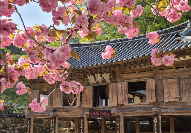 천년 고찰의 돌담과 지붕 너머로 겹벚꽃이 피어나는 모습은