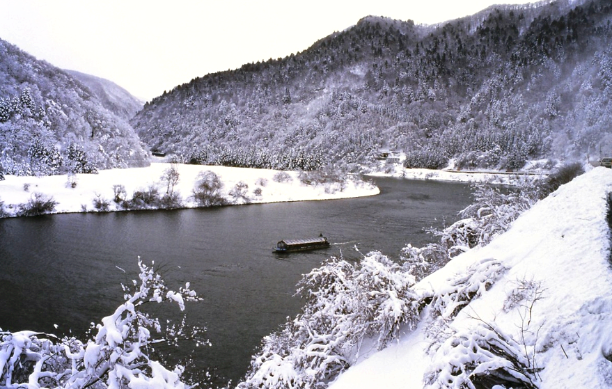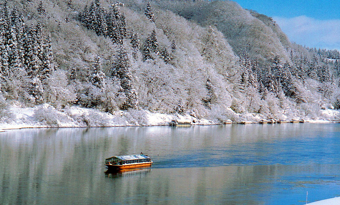 # 설경과 함께 유유히 흐르는 모가미강 뱃놀이