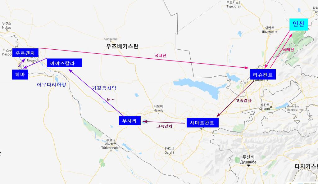 일정: 탸슈켄트, 사마르칸트, 부하라, 키질쿰 사막, 히바, 우르겐치 등