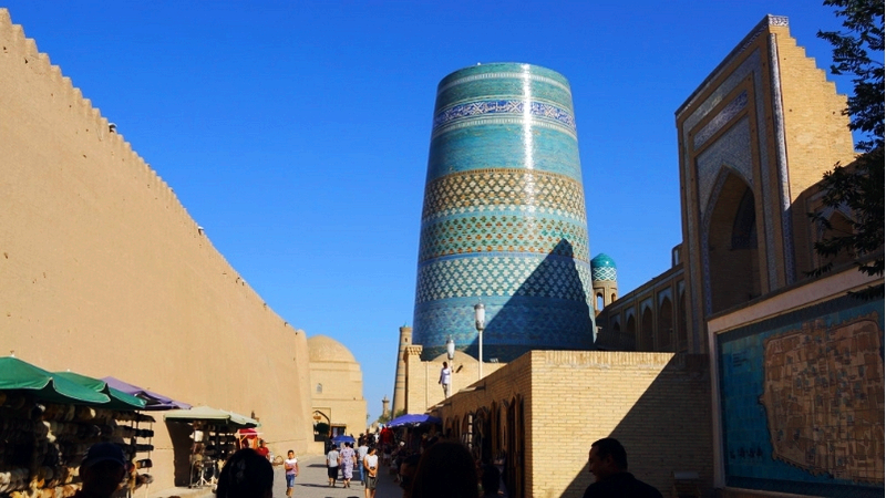 ▶히바의 상징이자 푸른색 타일로 뒤덮인 칼타미노르 미나렛