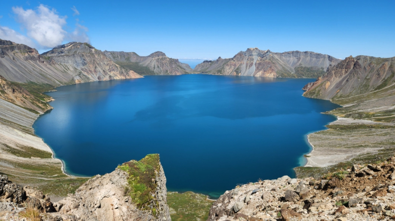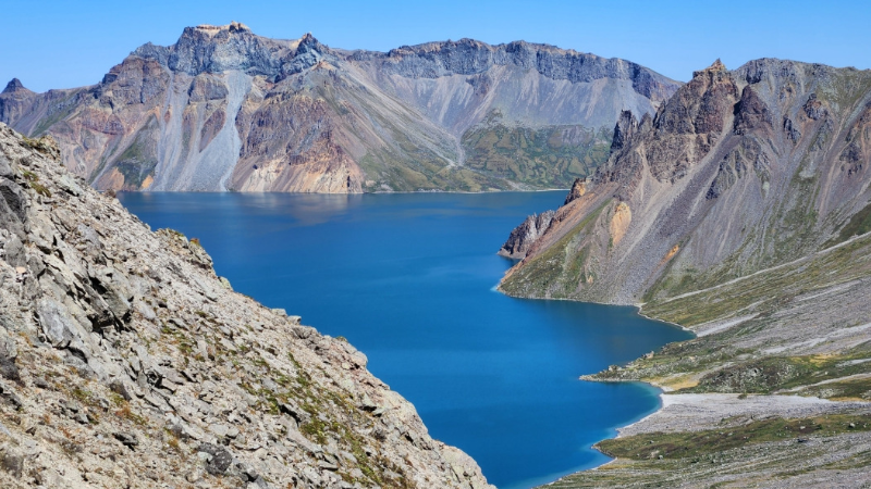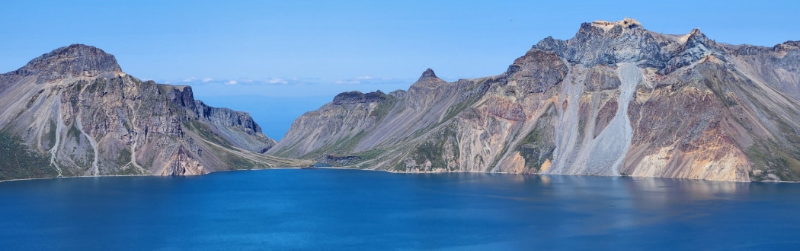 장막을 걷어내듯 신비로운 천지의 물빛이 모습을 드러내고
