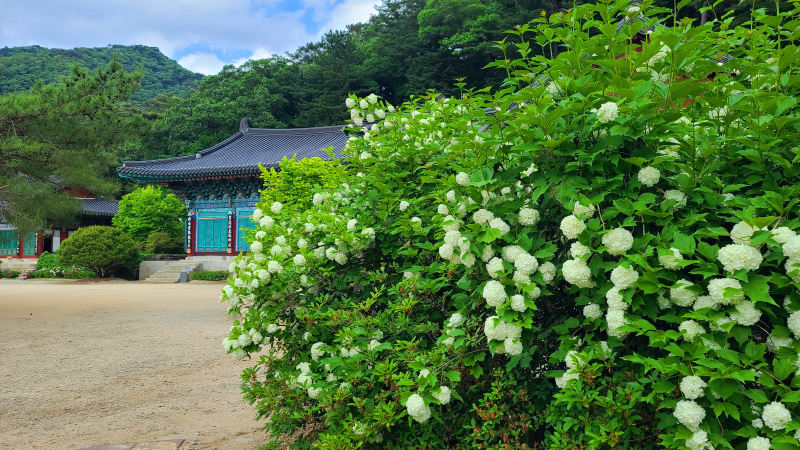 15:30 수타사 생태공원 불두화 터널, 제비붓꽃, 창포꽃, 떼죽나무꽃, 공조팝꽃, 산소길 걷기