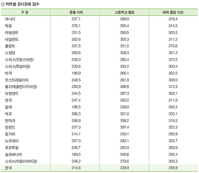산문, 문서, 수량 등 3개 영역을 평가하는 성인문해력은 학력이 높을수록 세계 수준과 큰 차이를 보였다. 중졸 이하 학력자의 문해 수준은 중하위권이었지만 대졸 이상 학력자는 △산문문해 19위 △문서문해 23위 △수량문해 21위 등 최하위권이었다. 금전출납 대출이자 계산 등 숫자를 이해하고 계산하는 능력인 '수량문해력'은 276.87점으로 세계 12위, 기사나 소설 등을 이해하고 사용하는 능력인 '산문문해력'은 269.2점으로 체코(269.4점)보다 낮고 영국(266.7점)보다 높은 13위였다. 이 연구위원은 "한글을 단순히 읽고 쓰는 국민은 많지만 숫자 문서 도표 등을 정확하게 이해하는 문해능력은 떨어진다"면서 "과학적이고 체계적인 문해 교육에 국가적인 지원과 관심이 필요하다"고 말했다.