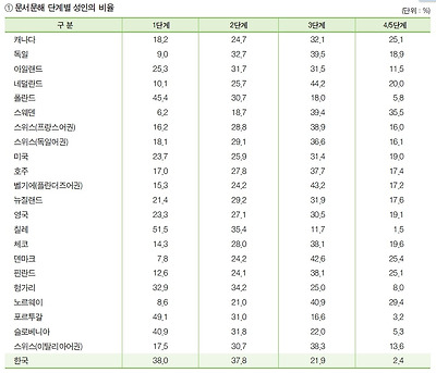 위 표에서 드러나듯이, 우리나라는 글자는 알지만 그 내용이 정확히 무슨 뜻인지 모르는 1단계가 무려 성인의 38퍼센트나 된다는 점을 알 수 있습니다. 그에 반해 고도의 지식 노동을 할 수 있는 4, 5단계는 2.4퍼센트밖에 되지 않습니다. 1위인 스웨덴과 비교할 때 1단계 수준의 비율이 6배 많다는 점도 문제지만, 4, 5단계는 17배 가까운 차이가 난다는 점이 더 큰 문제입니다.