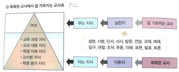체발라드에 의하면교사는 두 가지 지식을 구비해야 한다. '아는 지식'과 '주는 지식'이다. '아는 지식'은 교과 교육 관련 내용, 방법, 상황(학생, 교육과정, 사회적 맥락) 등에 대한 지식 즉 이론지를 말하고, '주는 지식'은 이러한 지식을 학생에게 직·간접적으로 전달, 제공, 촉진 및 공유하는 방법에 대한 지식 즉 실천지를 말한다. 아는 지식이 많은 교사는 똑똑한 교사이고, 주는 지식이 많은 교사는 잘 가르치는 교사이다. 좋은 교사는 똑똑한 교사를 넘어 잘 가르치는 교사로 나아가야 한다. 이것을 PCK와 교사 전문 지직의 관계를 논한 곽영순(2007:28)의 논의와 결합하여 제시하면 다음과 같다.