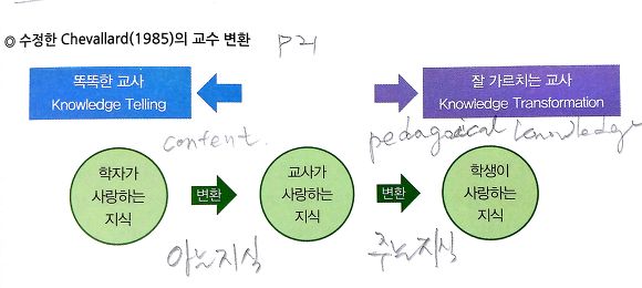 주는 지식이 뛰어난 잘 가르치는 교사가 흔히 사용하는 교수법 중의 하나가 Knowledgd Transformation이다. 잘 가르치는 교사는 학생의 수준을 고려한 눈 높이 교수법, 즉 학생 수준에 맞게 지식을 변환(Transformation)하여 가르친다. 이들은 학생이 지닌 선개념을 바탕으로 오개념과 난개념을 예상하고, 설명, 시범, 연습, 발문, 서사, 매체, 단서 등을 활용하여 부족한 지식을 가르친다.