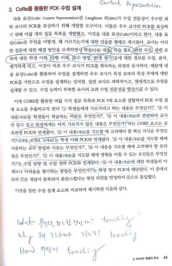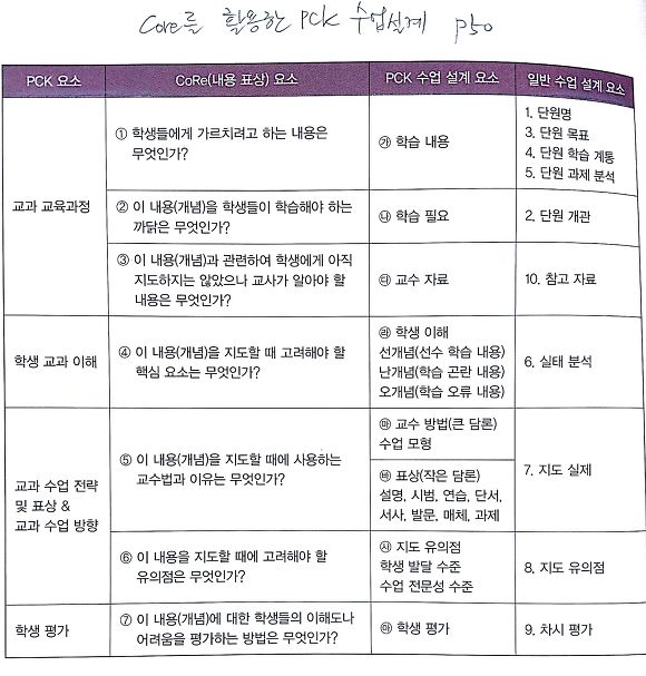 그러나 잘 가르치는 교사의 교수법을 중시하는 PCK 수업 설계는 교사주도의 수업으로 진행될 가능성이 높다. 아울러 교사의 가르침이 항상 학생의 배움으로 이어지는 것은 아니므로 PCK 역시 한계를 지닌다. 이에 우리는 구성주의 이론에 기초한 학생 공부법을 보완하였다. 여기에는 관찰, 추론, 조작, 메모, 요약, 토의와 토론, 발표 등이 해당되고, 우리는 이것을 학생 배움중심의 수업이라고 명명한다. 이를 위해 CORE를 활용한 교과별 PCK 수업 설계(안)을 구안한다.
