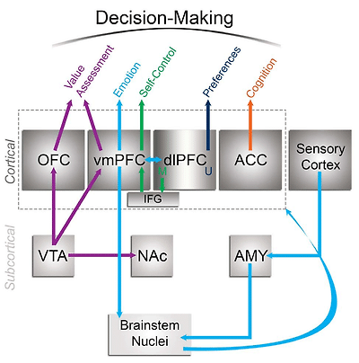 안와전두피질 OFC : 쾌감의 시작 - 도파민 분출 신호를 출력한다 - 향미의 쾌감을 반영하며, 그렇게 함으로써 음식물 섭취량을 조절한다