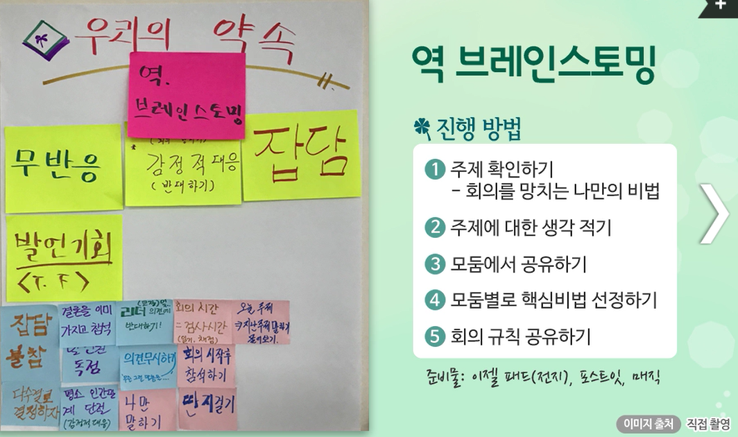 행동에 집중시키는 것이 '역브레인스토밍'기법이다. 사람을 비난하지 않고 구체적인 행동에 집중하며 공동체의 규칙을 정할 수 있도록 만들어 준다. (학급규칙 세울 때 좋은 방법일 듯 하다.) 학교규칙 세우기는 학교자치를 세우는 중요한 출발점이기도 하다. 축구에서 규칙을 지키지 않으면 더 이상 축구가 아니듯이 회의에서 규칙을 지키지 않으면 더 이상 회의라고 할 수 없기 때문이다.