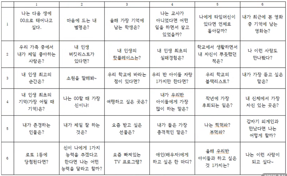 * 전입교사 환영회, 학급 학부모회 등에서 할 수 있으며 상황에 따라 재미있게 만들어서 진행할 수 있다.
