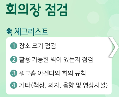 * 안내가 중심인 회의는 좁은 공간도 가능하지만 긴 협의시간이 필요한 회의는 넓은 장소가 바람직하다.
