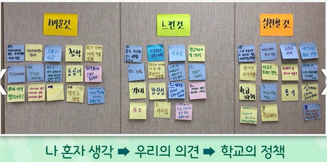 - 교육 이념과 같이 아이들이 민주시민으로 자라나게 하려면 교사들은 학교에서 민주적인 삶(자치)을 살아나가야 한다.