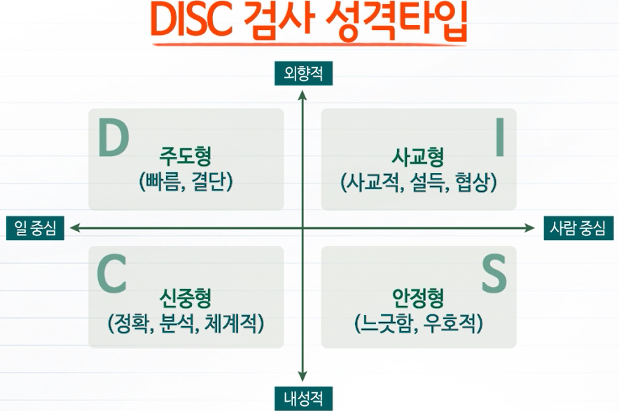 - DISK 검사: 사람의 성격을 '외향', '내향', '사람', '일'로 구분하여 4가지 유형으로 나타내는 성격검사 도구를 말함.