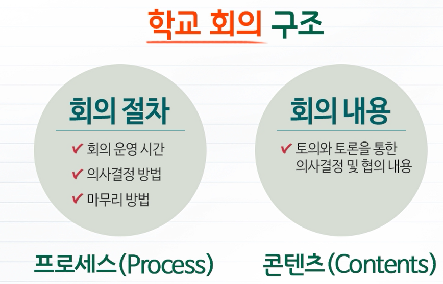 - 회의 = 학교에서 교사들이 무엇을 할 것인지 결정하는 활동이다. 그리고 어떤 학교가 얼마나 학교자치가 잘 이루어지는 살필 때, 그 학교의 의사결정방식을 보면 알 수 있다. (김성천외(2018), 학교자치, 즐거운 학교, p132참조)