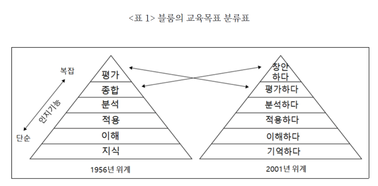 블룸의 교육목표 분류학(Bloom's Taxonomy)**은 1956년 교육 심리학자 벤자민 블룸(Benjamin Bloom)이 제안한 교육 목표를 체계적으로 분류한 모델입니다. 이 분류학은 학습 목표를 인지적(Cognitive), 정의적(Affective), 심리운동적(Psychomotor) 세 가지 영역으로 나누고, 특히 인지적 영역에서 학습의 깊이를 단계별로 구분하여 설명합니다. 이는 교육자들이 학습 목표를 명확히 하고, 학생들의 학습 결과를 평가하는 데 유용한 틀을 제공합니다.
