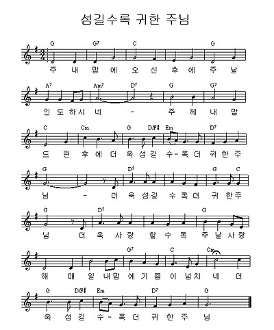 주 내맘에 모신 후에 날 주장 하시네 (주 날 인도 하시네) 주께 내 맘 드린 후에 더욱 섬길수록 더 귀한 주님 더욱 섬길수록 더 귀한 주님 더(욱) 사랑할수록 주 날 사랑해 매일 내 맘(속)에 기쁨 넘치네 더욱 섬길수록 더 귀한 주님