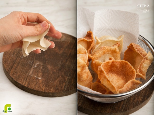 아낀다고 자작한 상태에서 튀겨도 모양이 벌어져 컵 모양이 안 됩니다. 가능하면 만두피가 완전히 기름에