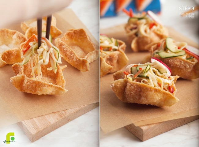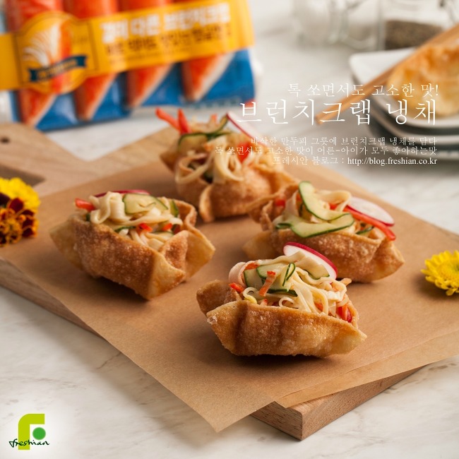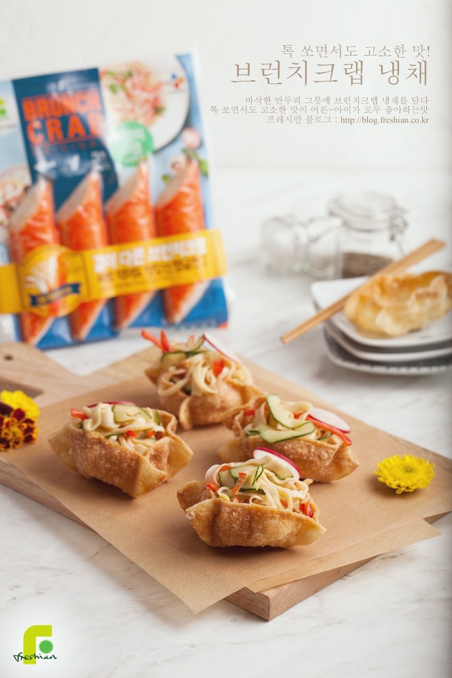 만두피컵에 브런치 크랩을 이용해 만든 맛살 냉채를 넣어주면 맛있는 반찬 만들기가 완성되었습니다.