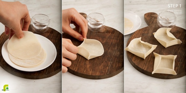 만두피 4군데에 물을 조금 묻힌 후 손가락으로 꼬집어