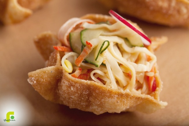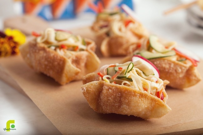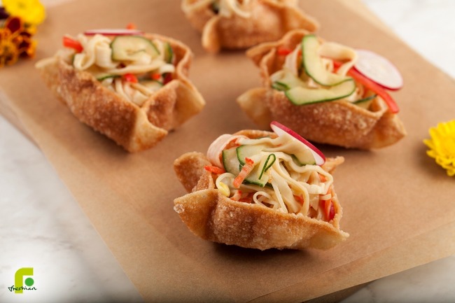 냉채로 먹어도 좋지만, 브런치 크랩의 폭신한 식감 그리고 야채의 아삭한 식감에 바삭한 식감까지 더하기 위해 만두피로 컵을 만들어 담았습니다. 다양한 식감의 요리로 한번 먹으면 멈추기 힘든 요리 중 하나에요.