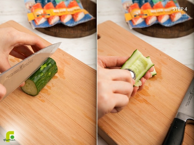 오이를 1/4 등분한 후 반을 갈라줍니다.