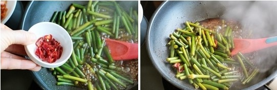 마늘쫑을 넣고 볶는 중간에 홍고추를 넣고