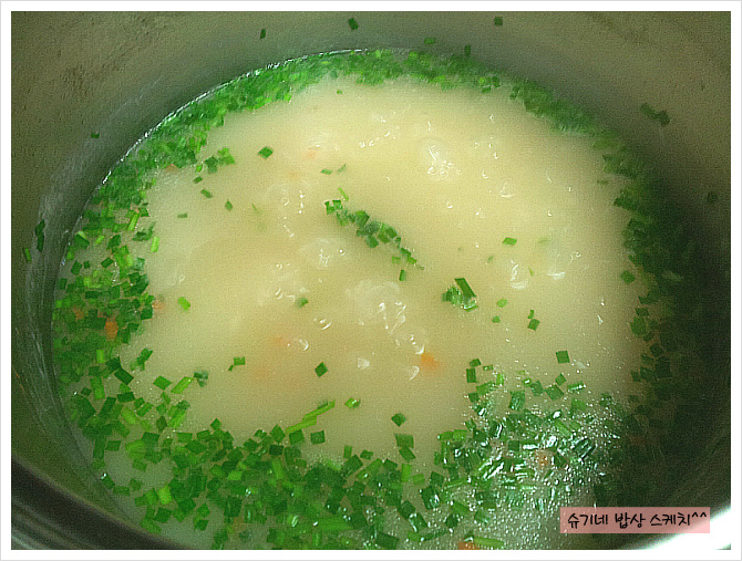 애벌 삶기를했으니 잘 저어가며 이삼십분 익혀주면 완성입니다.