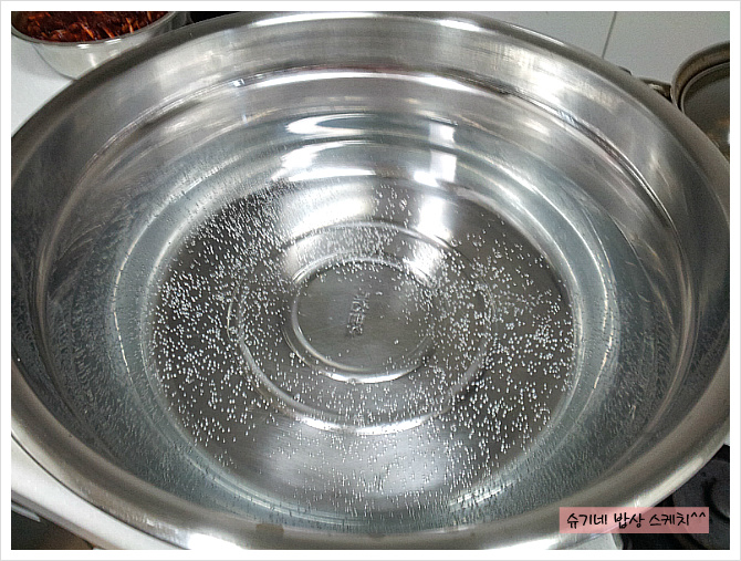아주아주 넓은 웍이 없다면 스텐다라를 가스에 올리고 데칠 물을 끓입니다.