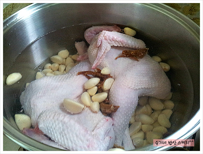 아이들 줄라고 토종닭 두마리에 홍삼과 마늘 듬뿍넣고 두시간 가까이 푹푹 삶아줬습니다.^^