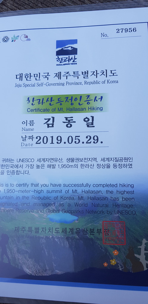 등반기념으로 제주특별자치도에서 주는 인증서를 발급받았습니다