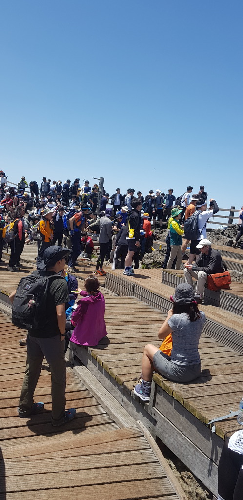 백록담을 배경으로 사진찍는 사람들이 줄을 서있고....