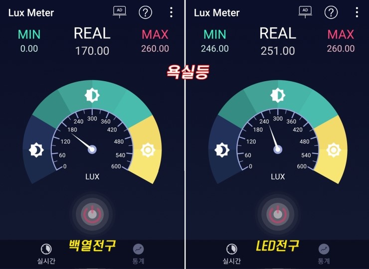 밝기를 측정해보니 백열전구는 170룩스가 나오고, LED 전구는 252룩스가 나왔습니다. LED 전구가 48% 더 밝습니다.