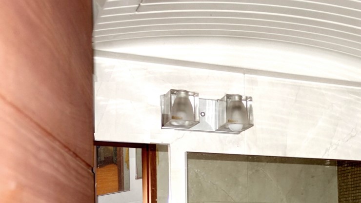 3개 있는 식탁등 보다 2개 있는 욕실등이 더 밝은 것은 욕실은 좁은 공간에 흰타일로 벽이 되어 있어서 그렇습니다.